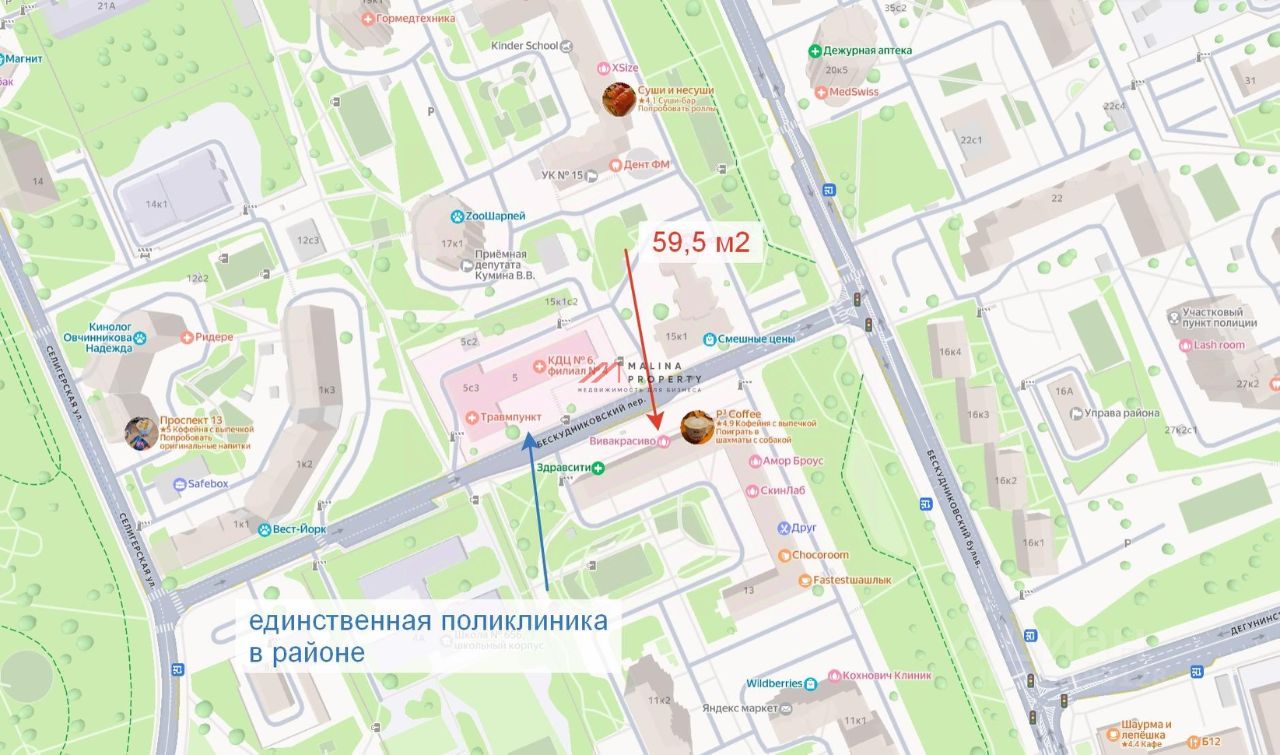 Аренда торгового помещения 59,5 м2 на Бескудниковском бульв., д 13 (9 минут пешком от метро Верхние Лихоборы). 1-я линия домов.