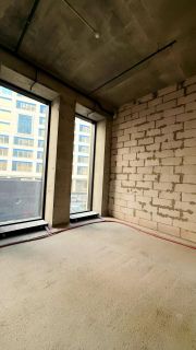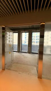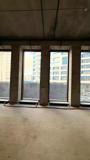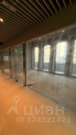 Проходим через лобби и первое помещение. - Ваше. Площадь 44 м². Высокие потолки 4,5 метра, витринное панорамное остекление. Формат свободной планировки — универсально под разные задачи.