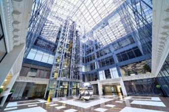 Описание помещения: Окна выходят в атриум. В блоке большая рабочая зона, есть несколько выделенных кабинетов и стойка ресепшн на входе.