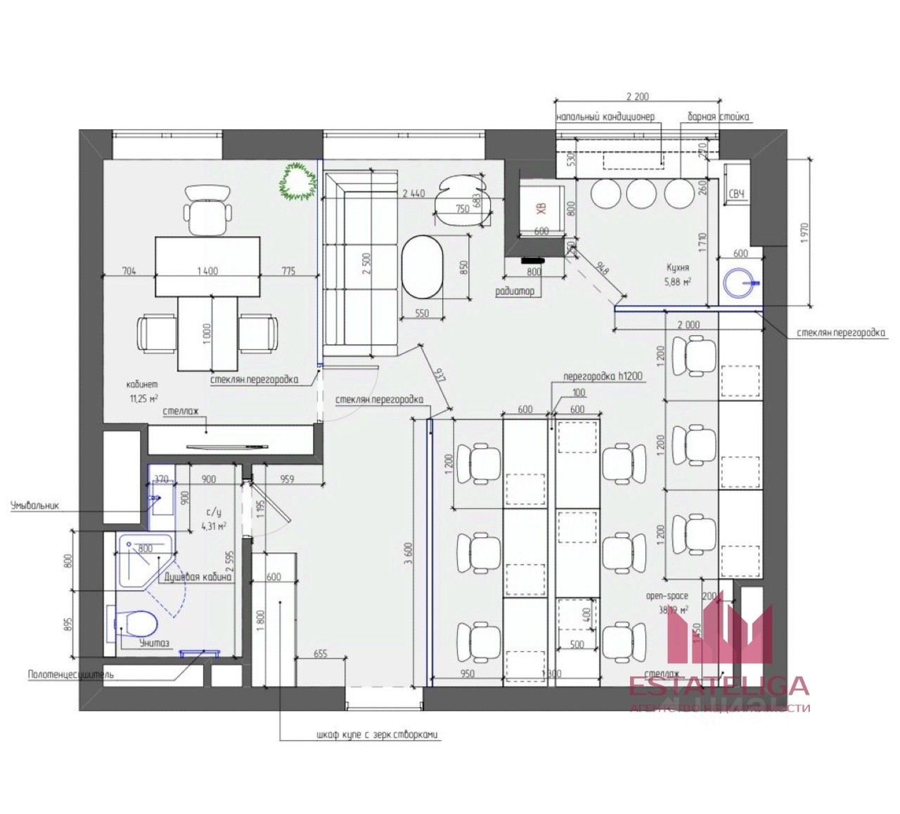 Офис с качественной отделкой в стиле Лофт, один изолированный кабинет, зона Open space, кухня с техникой, санузел с душевой кабиной. Пространство идеально подходит для команды, ценящей современный дизайн и функциональность.