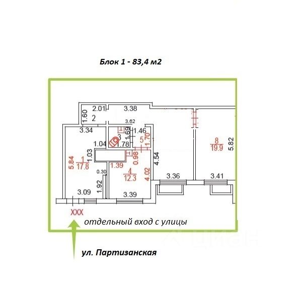 Первый этаж, отдельный вход с улицы Партизанская. Вывеска над входом.