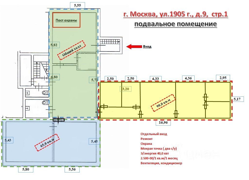 Предлагается в аренду помещение свободного назначения в пешей доступности от станции метро "улица 1905 года", хороший трафик, 2 мокрые точки, вентиляция. Парковка на территории. Арендные каникулы 1 месяц.