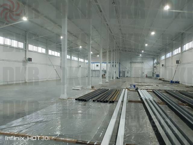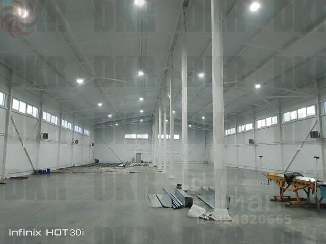 Помещение отапливаемое. Высота потолка 8-10м(в коньке). Бетонный пол.Полимерное покрытие,нагрузка не лимитируется. Автоматические сегментные ворота.Электроэнергия 80 кВт, по счетчику. Собственная скважина и собственный септик. ,