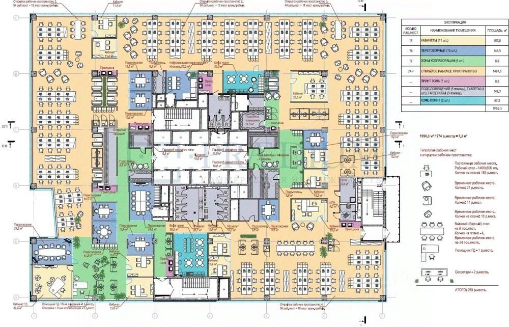 Площадь этажа ~2,400 кв.м., на нем можно комфортно разместить около 274 рабочих мест см. прилагаемый тестовую рассадку этажа;