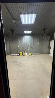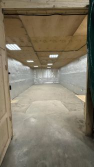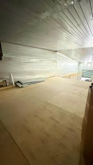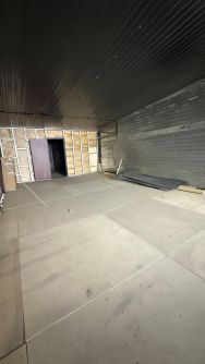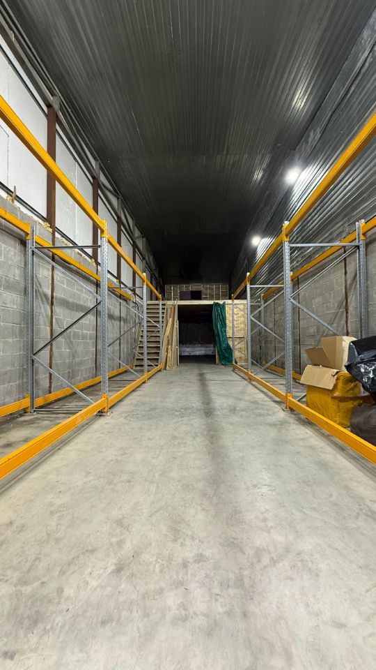 Помещение чистое и удобное для работы: ровный залитый пол. Это 2 соединенных помещения по 60 кв (общая квадратура 120 метров) - в одном помещении возможно хранить товары на палетных стеллажах (стеллажи из фото уже демонтированы), во втором помещении ровный пол с полотком 3 метра и построен второй этаж также с потолками 3 метра. Есть автоматическая роллета, работает с пульта — удобно для разгрузки и доступа. Общая высота потолков 6 метров.