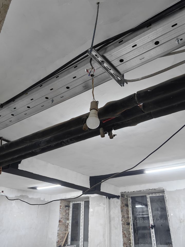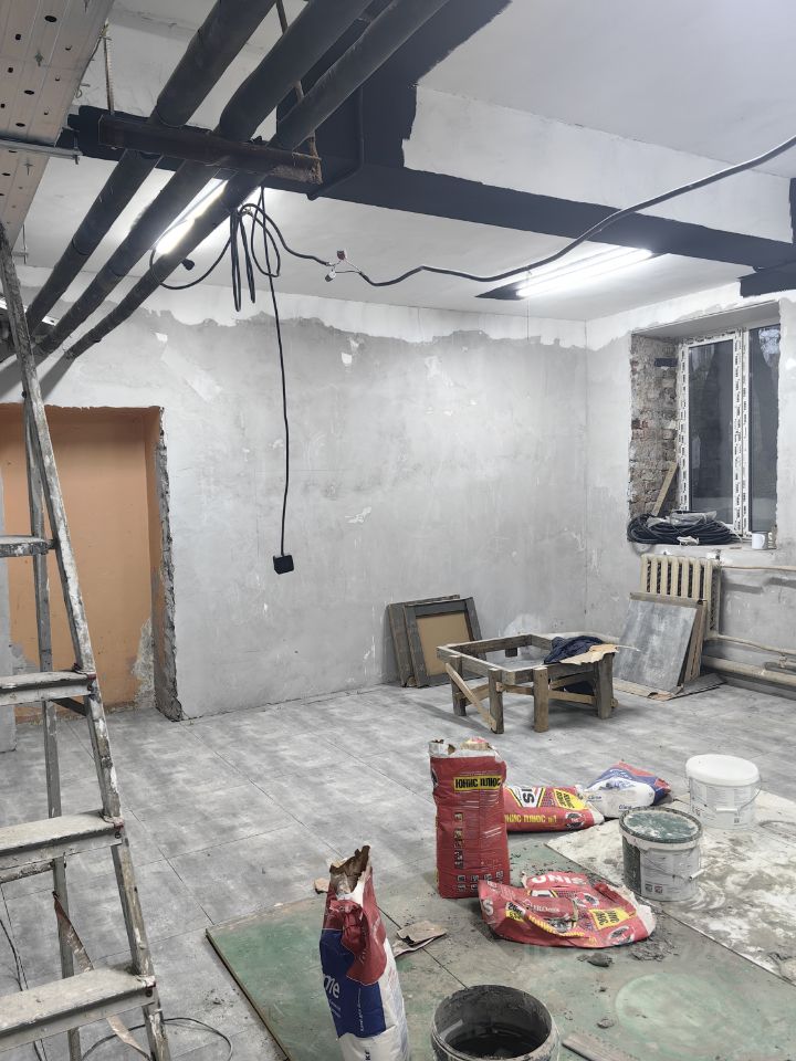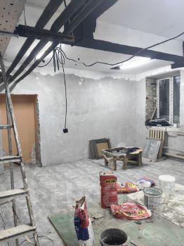 Собственный сан узел. Завершается ремонт, на полу плитка, стены белые, потолок в стиле лофт.