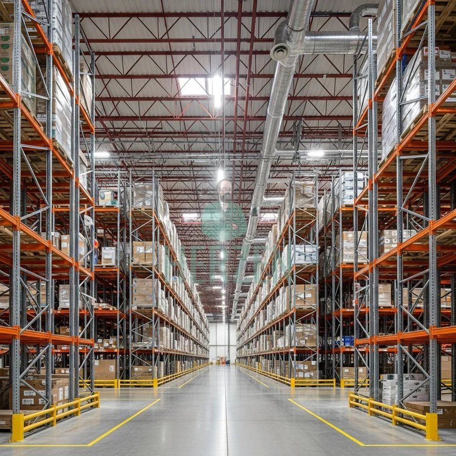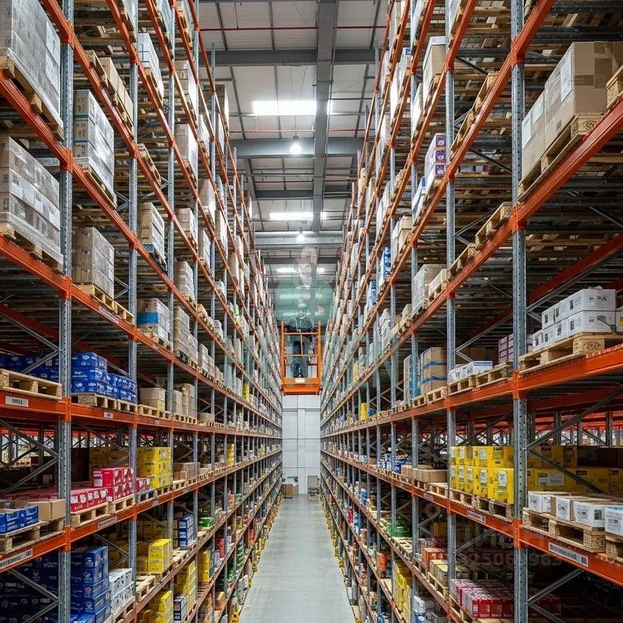 На складе установлены фронтальные стеллажи. До 35000 паллетомест. Высота несущей стойки 10,4 м.