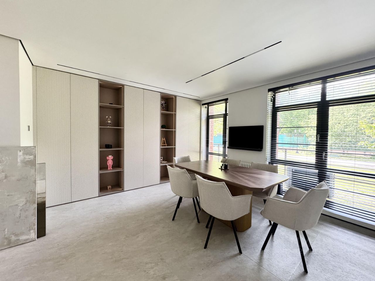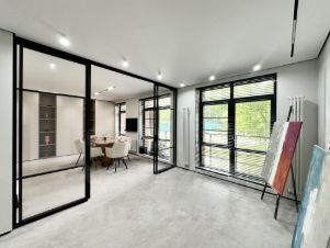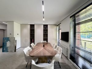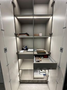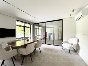 Эффективное зонирование: холл, кабинет с большим переговорным столом и зоной отдыха, второй кабинет, отделенный стеклянной перегородкой, санузел. Продуманная система хранения с барной зоной, зонами хранения, а также встроенной оргтехникой, спрятанной от глаз.