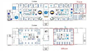 Описание помещения: Офисный блок вместимостью на 171 полностью оборудованных рабочих мест.