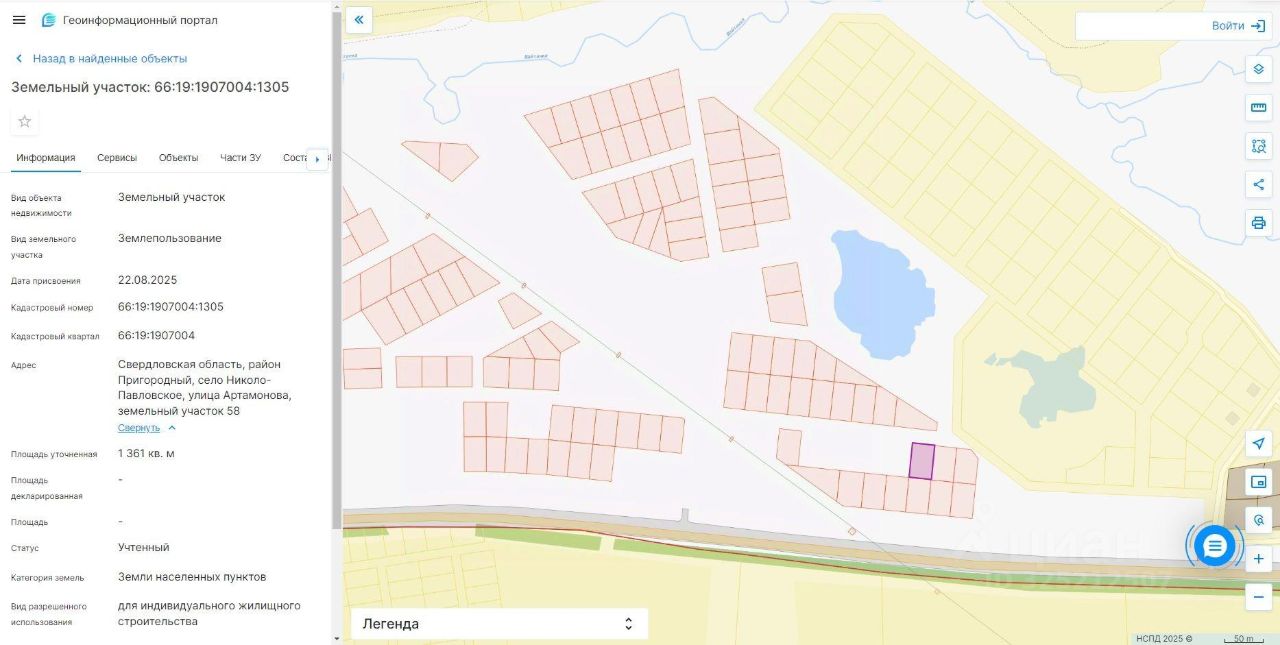 местоположение земельного участка Свердловская область, Пригородный район, село Николо-Павловское, улица Артамонова, земельный участок 58. • площадь 1361 кв.м • кадастровый номер 66:19:1907004:1305; • категория земель земли населенных пунктов; • вид разрешенного использования для индивидуального жилищного строительства; • цель использования земельного участка для индивидуального жилищного строительства; • обременения нет; • ограничения в использовании нет. Государственная собственность земельного участка не разграничена.