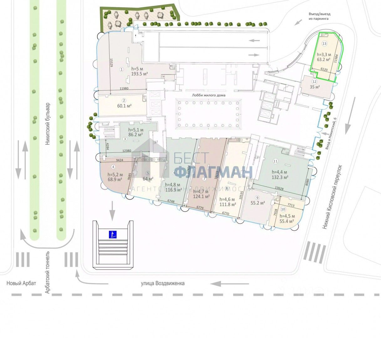 Арт. 128052503 В аренду предлагается торговое помещение в доме de luxe класса "Никитский 6", расположенном на пересечении улицы Воздвиженка и Никитского бульвара. Напротив находится станция метро "Арбатская", в пяти минутах ходьбы - Большая Никитская улица и район Патриарших прудов.