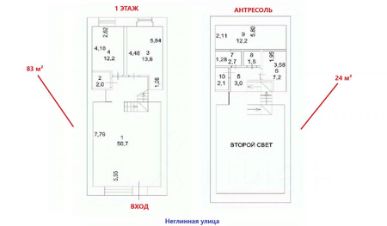 Помещение в два уровня: 1 этаж 83 м² и антресоль 24 м². Смешанная планировка, витринные окна, отличная видимость с улицы. Помещение с отделкой после выезда арендатора. Высота потолков 5.5 метров, мощность 31 кВт.