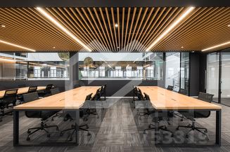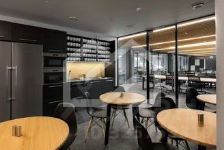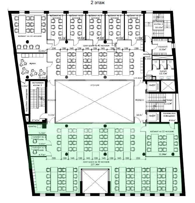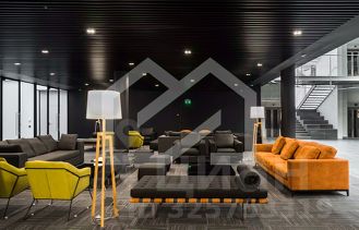 - Сервисный офис на 100 мест со всеми необходимыми общими зонами: кухня, сан. узлы, гардеробная комната, принтерная зона.