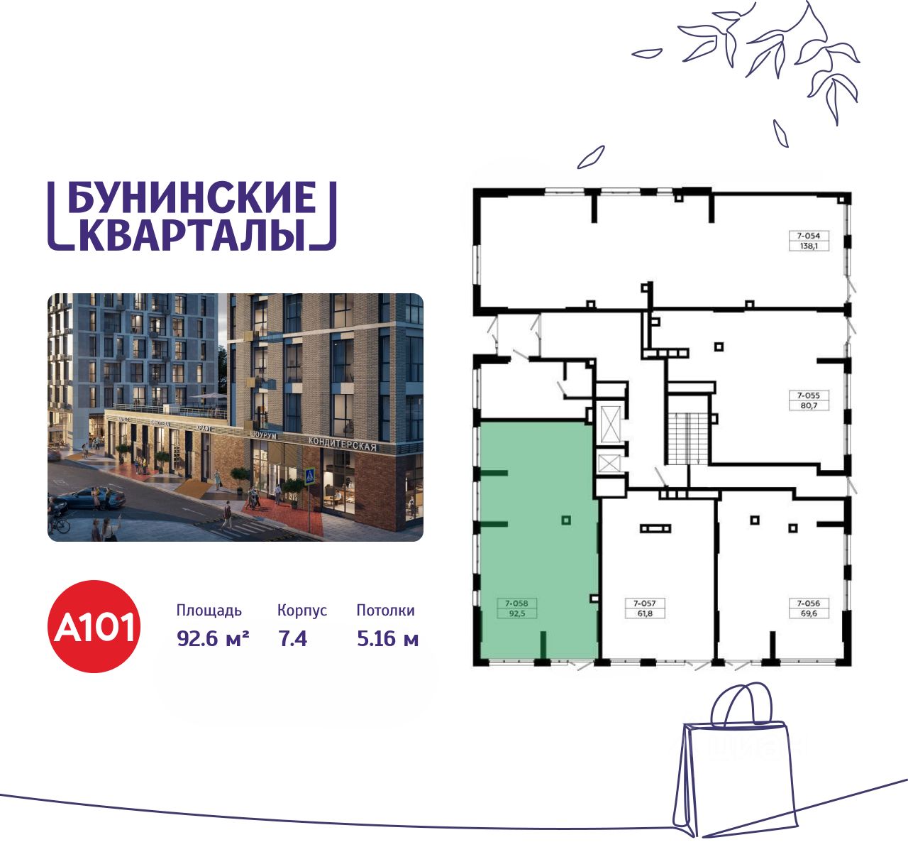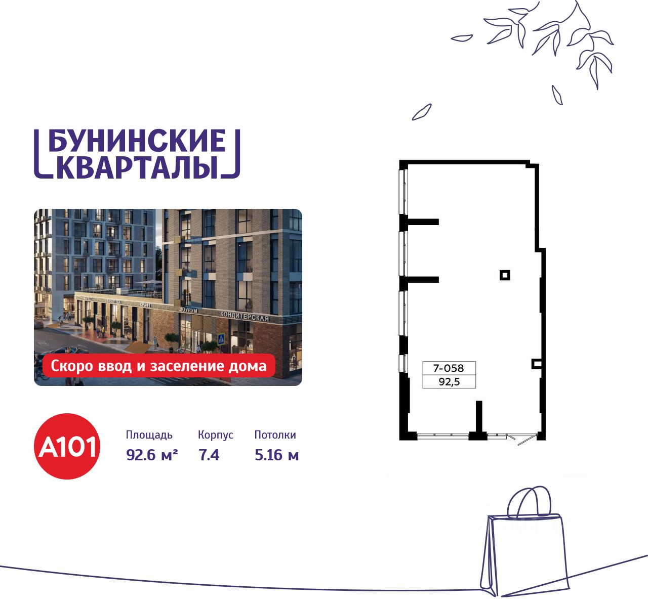 Сдается помещение площадью 92.60. на 1-м этаже ЖК "Бунинские кварталы".