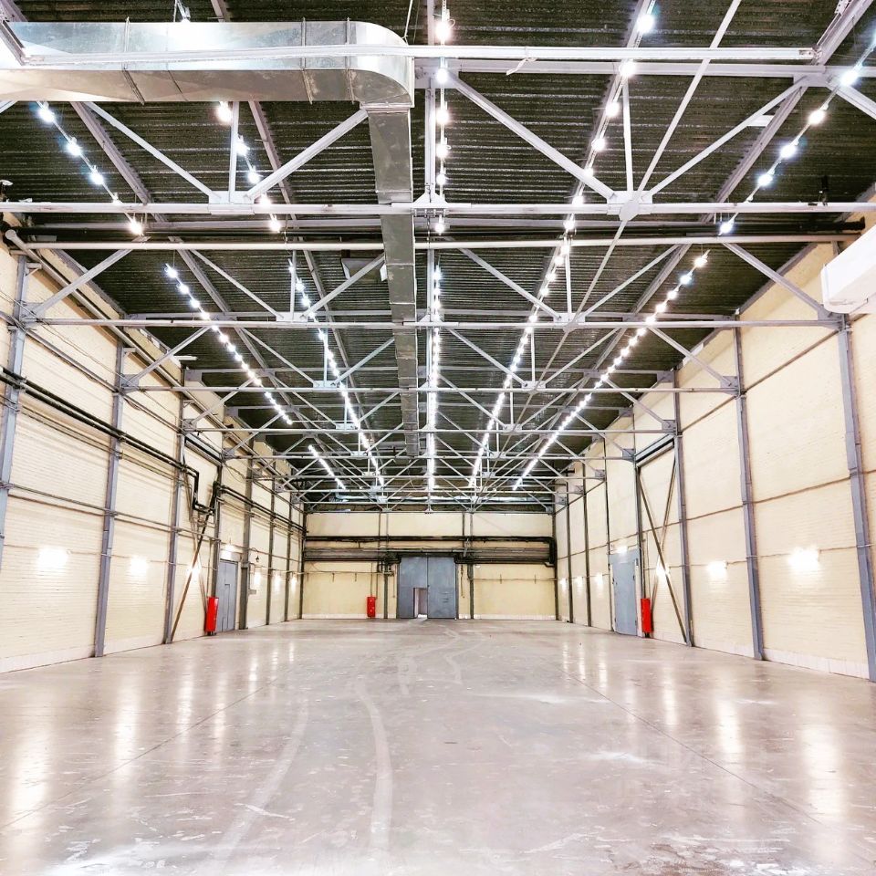 Высота потолка 4-10.06 м. (рабочая высота склада до ферм перекрытия - 7,5 м);