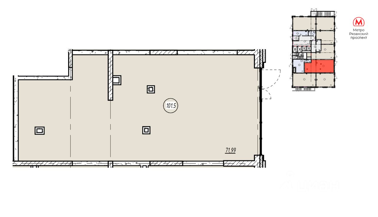 Помещение расположено на первом этаже современного жилого комплекса комфорт-класса Первый Рязанский. Ключевое преимущество — беспрецедентная близость к метро. Всего 30 метров входа до вестибюля станции Рязанский проспект, обеспечивающая прямой доступ к потоку более 60 000 человек в день.