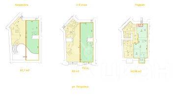 1-й этаж 82 м2, антресоль 62,7 м2, подвал 68,98 м2, 1-я линия домов.