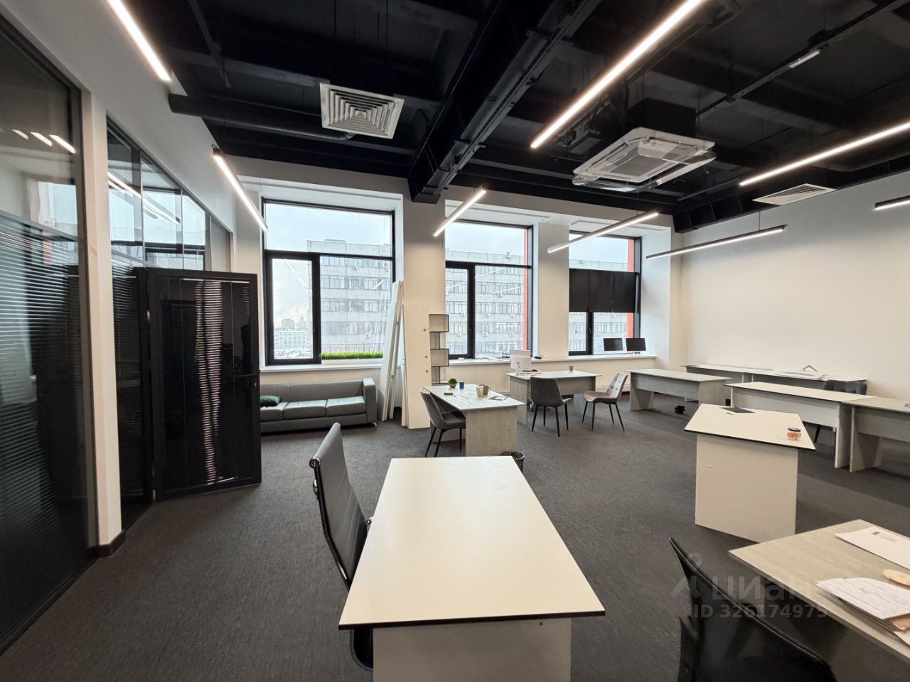 Помещение состоит из опен спейса и трех отдельных кабинетов, внутри высокие потолки и большие окна.