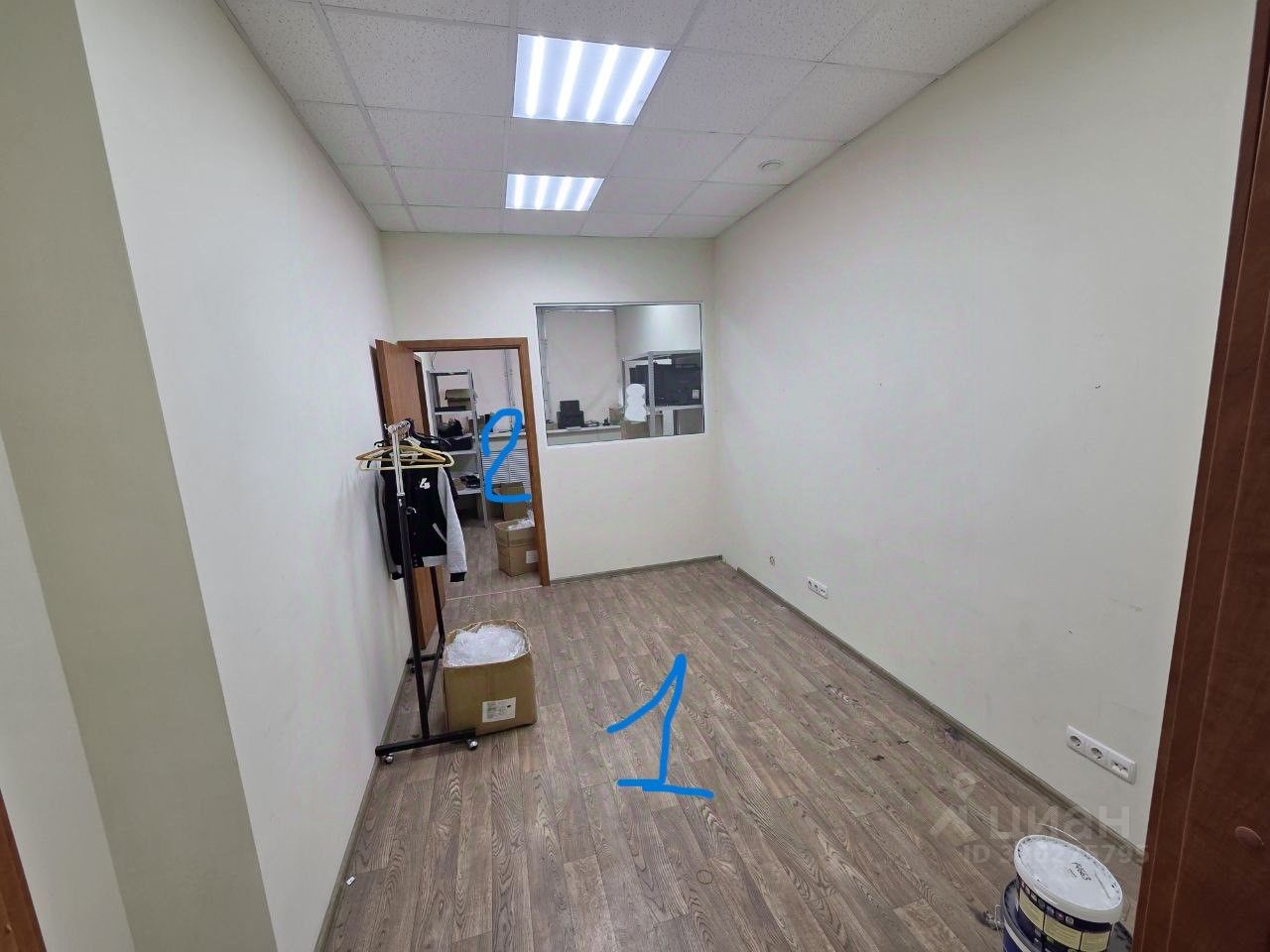 Светлое помещение с окнами, состоит из 2-х блоков с дверьми из общего коридора.