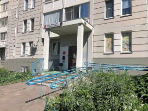 Находится на проходимом месте с торца здания. Рядом с пешеходными зонами и парковками.