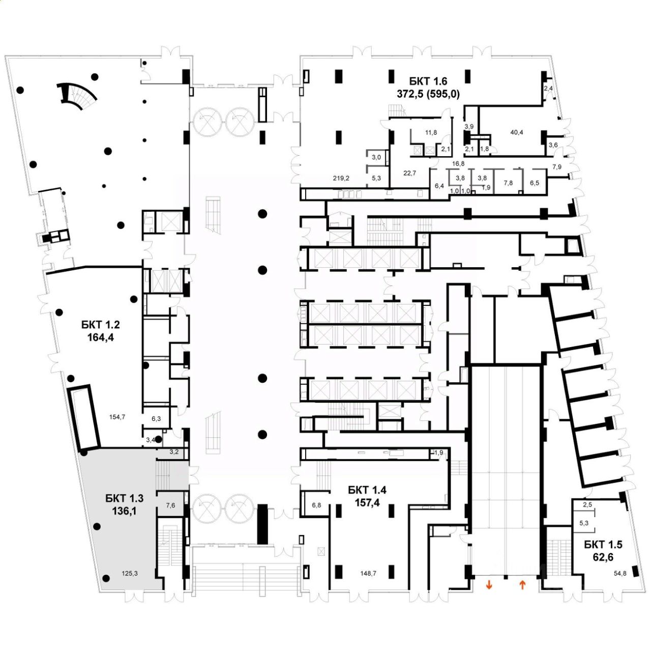 5 отдельных лифтовых групп, в т.ч. 17 грузопассажирских лифтов