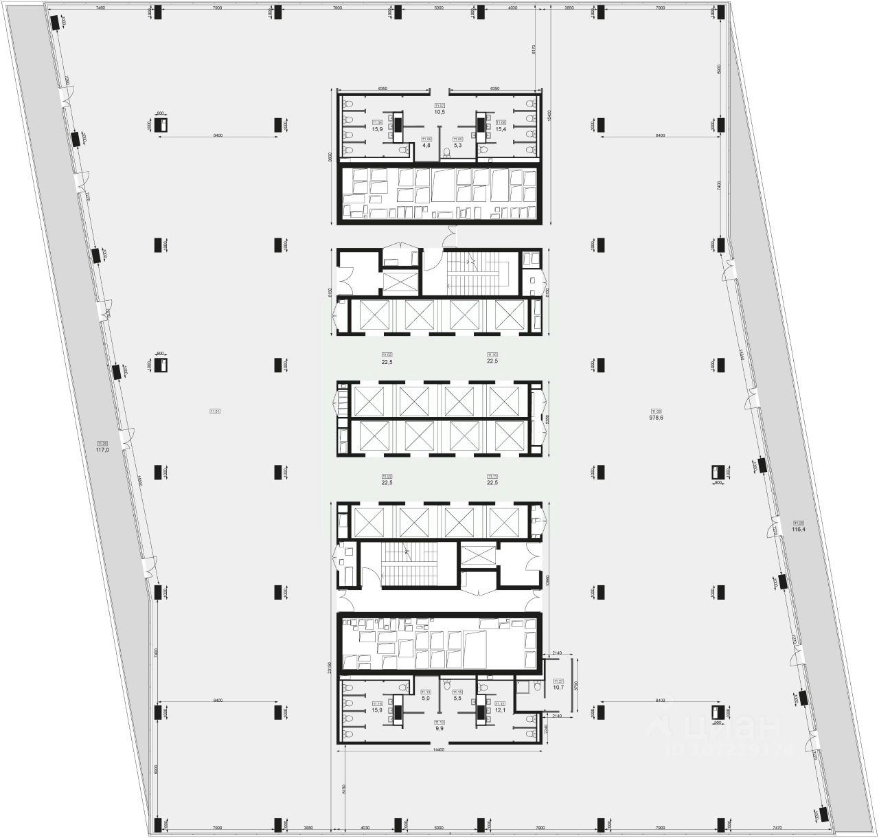 5 отдельных лифтовых групп, в т.ч. 17 грузопассажирских лифтов