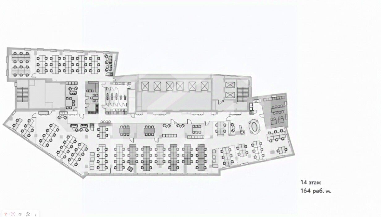 - Смешанная планировка: рабочая зона, переговорные комнаты, лаундж-зона, кухня