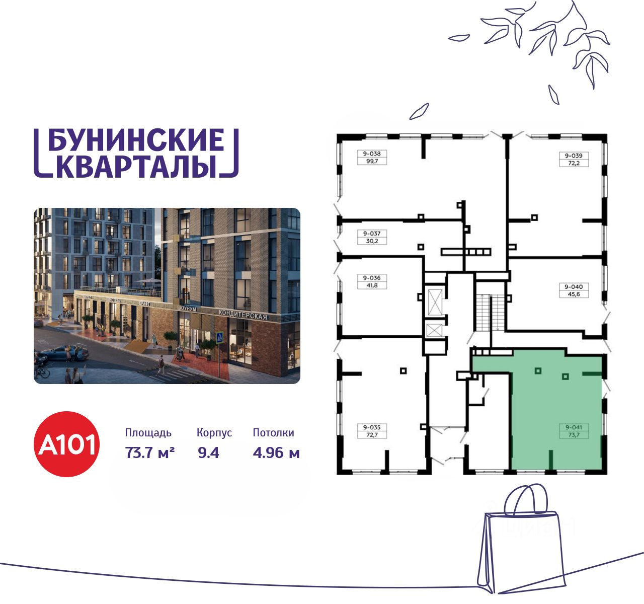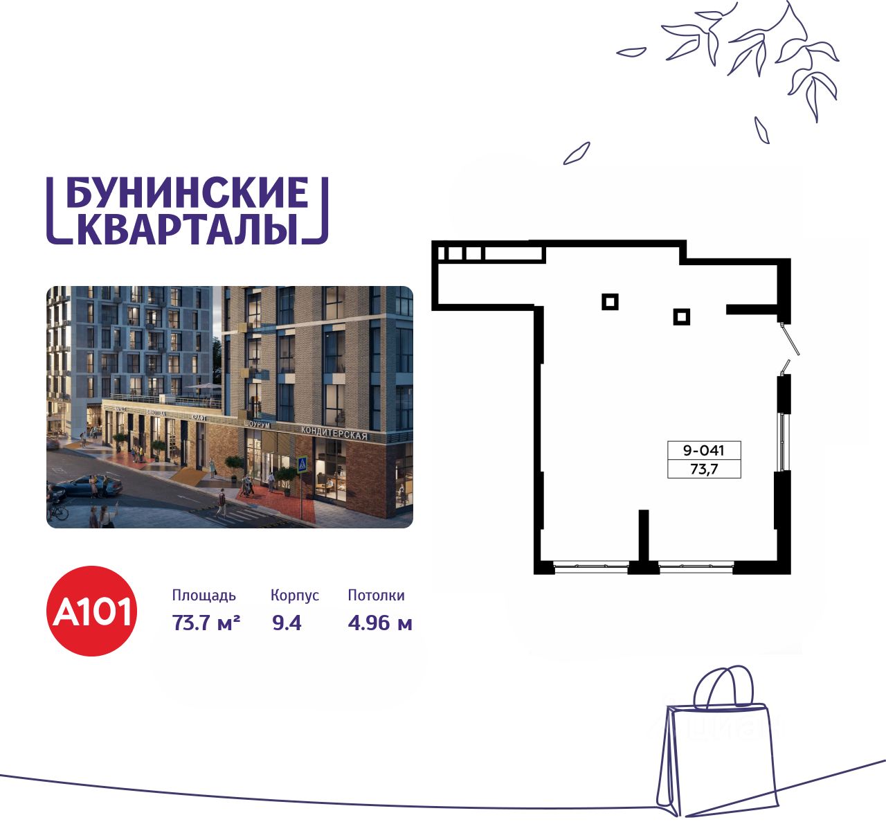 Сдается помещение площадью 73.70. на 1-м этаже ЖК "Бунинские кварталы".