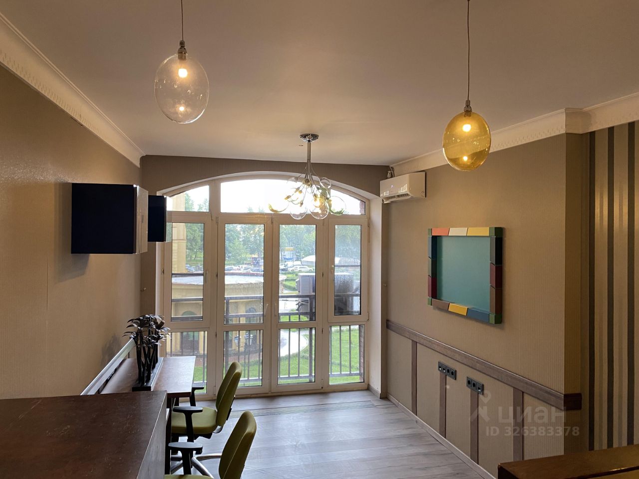 Собственная реклама видна большому количеству людей. Панорамное остекление во всю стену. Вид во двор на фонтан. Южная сторона.