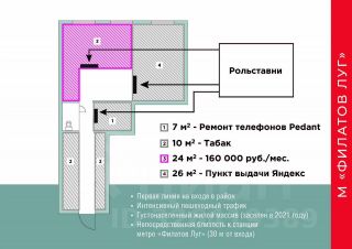 Часть помещения с отдельной дверью (рольставни), площадь 26 кв. М. На первой линии ЖК напротив выхода из метро Филатов Луг (ЖК Саларьево-Парк). Единственные небольшие площади на первой линии в прямой видимости и в 1 минуте ходьбы от метро Филатов луг. Отсутствие маленьких метражей в торговой зоне жилого комплекса. Рядом с магазином Вкусвилл (соседнее помещение, дверь в дверь). Вход в район. Большая парковка перед помещением. Конечная остановка автобусов и маршрутных такси напротив входа в помещение. Высокий обеспеченный пешеходный траффик на входе в район.