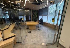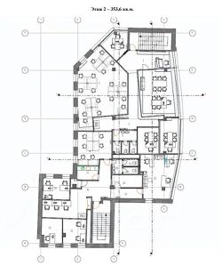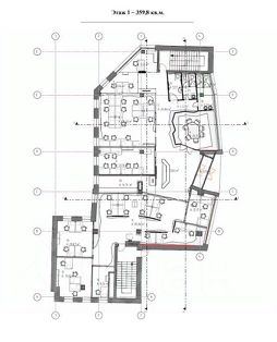 1 этаж - 360 м2, состоит из зоны ресепшн, рабочих мест, переговорной комнаты, сан.узлы.
