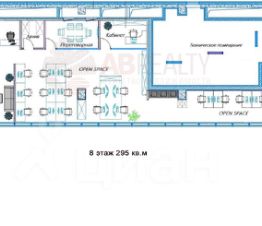 8 этаж. Планировка: зона ресепшен, coffee point, серверная, 4 кабинета, open space пространство, с/у.