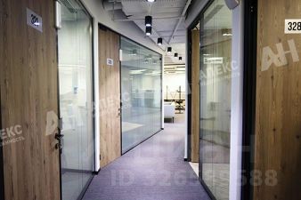 Офис находится на третьем этаже, выполнен по дизайнерскому проекту под клюсч. Имеет панорамным остекление и высокие потолки 5.1 метров.