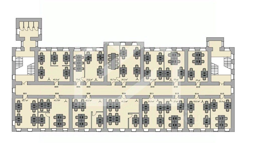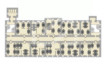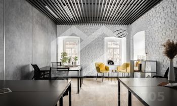- Планировка кабинетная; предусмотрены переговорные, общие зоны, кухня