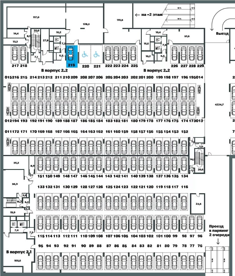 Широкое (около 3м) обособленное машино-место 16 м2 на м -1 этаже с удобным заездом и посадкой. На плане 219 примыкает к подъезду 2 (2.2.1). Стоимость включает в себя эксплуатацию и коммунальные платежи. Официальный договор. Возможна установка шкафа.