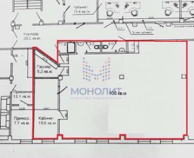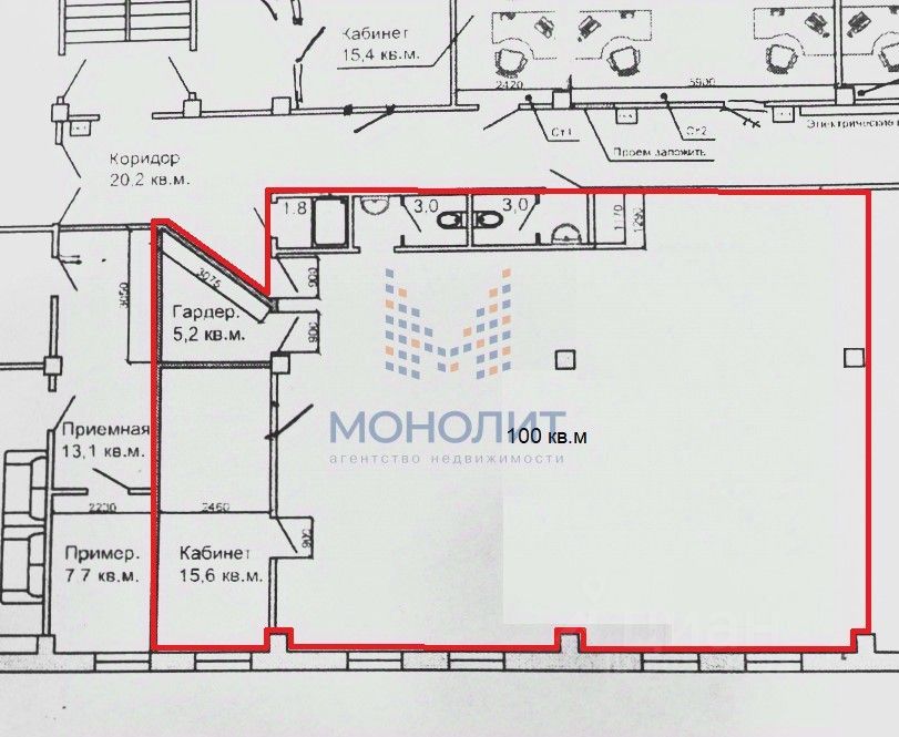 Опен спейс 100м2, два кабинета (18м2 и 7м2) и два отдельных санузла.