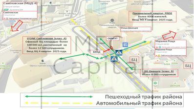 Объект на первой линии, в пешей доступности от станций метро Марьина Роща, Савёловская и одноименной МЦД. Динамично развивающийся район, новый дом премиум класса, стоимость квадратного метра квартиры 600 000 - 900 000 руб/м2. Более 4000 жителей в квартале PRIDE, 12 500 сотрудников БЦ Савёловская, 8 000 сотрудников БЦ Двинцев. Высокий пешеходный трафик. Стрит ритейл. Отсутствуют конкуренты.