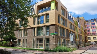 Подвальный этаж дома с апартаментами. Три входа в здание с разных сторон. Три больших лифта. Пропускная система (магнитные карты). Работает ресепшн.