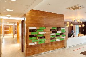 Подвальный этаж дома с апартаментами. Три входа в здание с разных сторон. Три больших лифта. Пропускная система (магнитные карты). Работает ресепшн.