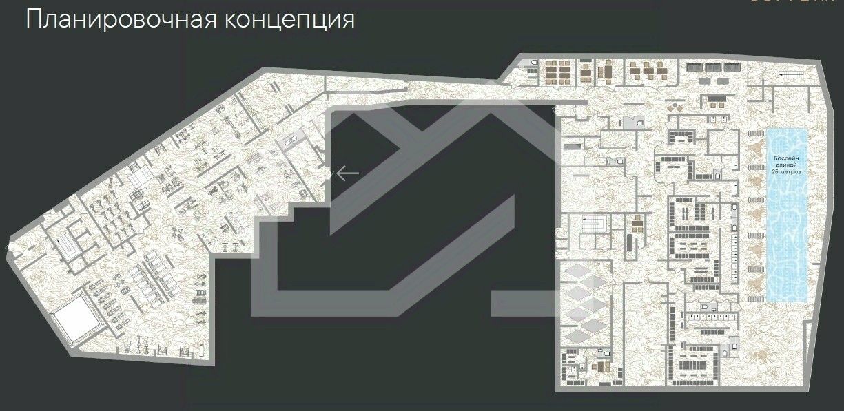 -концепцией предусмотрено функциональное зонирование, бассейн 25 метров, тренажерный зал, боксерский ринг, залы групповых программ, детский фитнес, студия пилатеса, студия сайкла, массажные кабинеты, солярий, SPA;