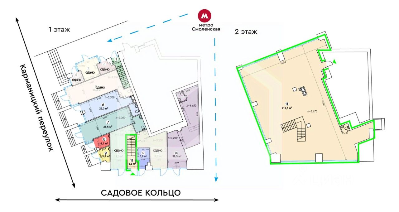877585-s . Предлагаем помещение свободного назначения в бизнес-центре "Арбат", площадью 218.9 кв. м, расположенное на первом и втором этажах 9-этажного здания.