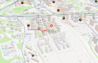 Помещение 56 м2 располагается на 1 этаже в стилобатной части жилого дома, открытая планировка, отдельный вход с фасада, высота потолка 4 м, витринные окна по фасаду.
