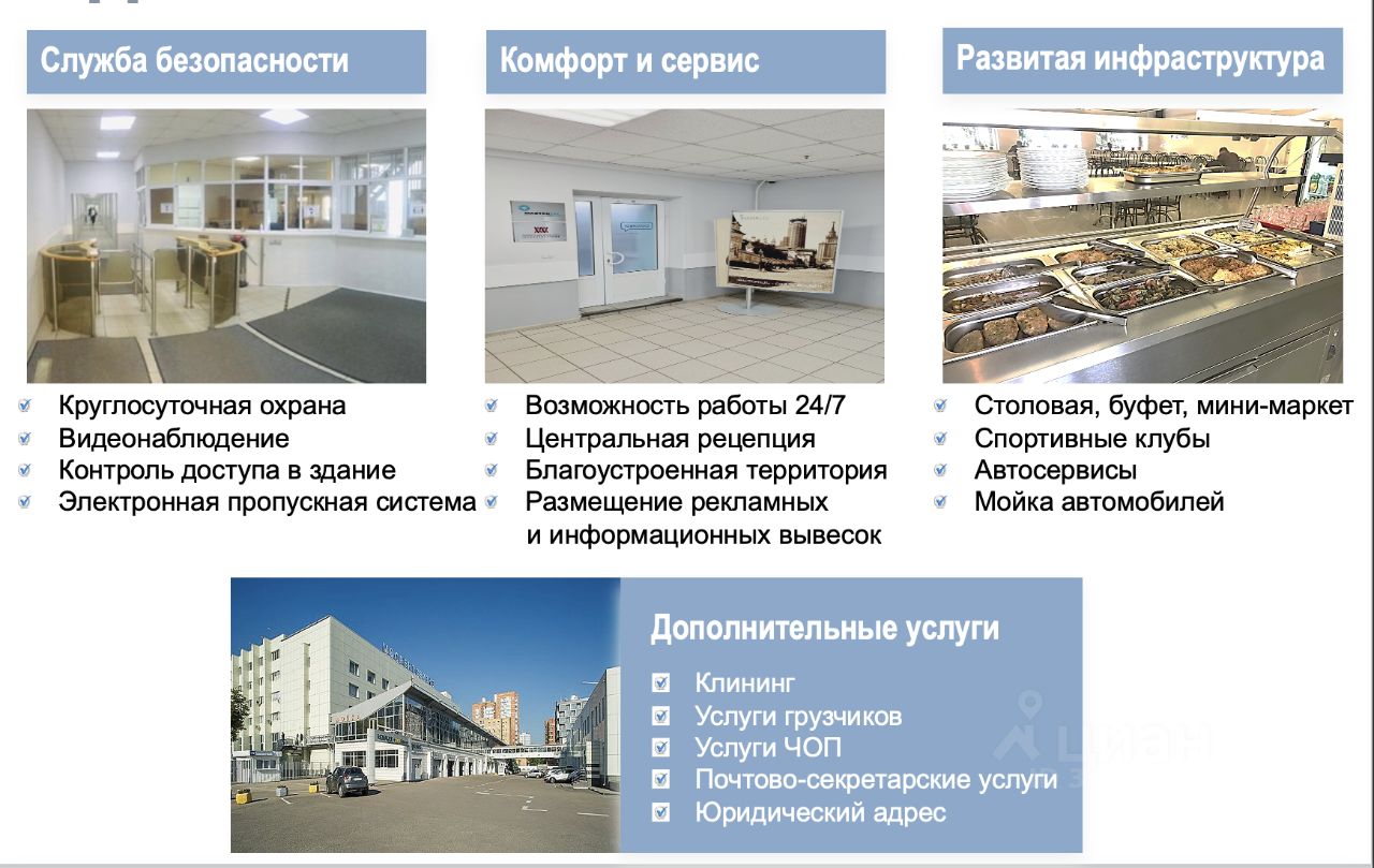 На территории имеются столовая, буфет, спортивные клубы, автосервисы.