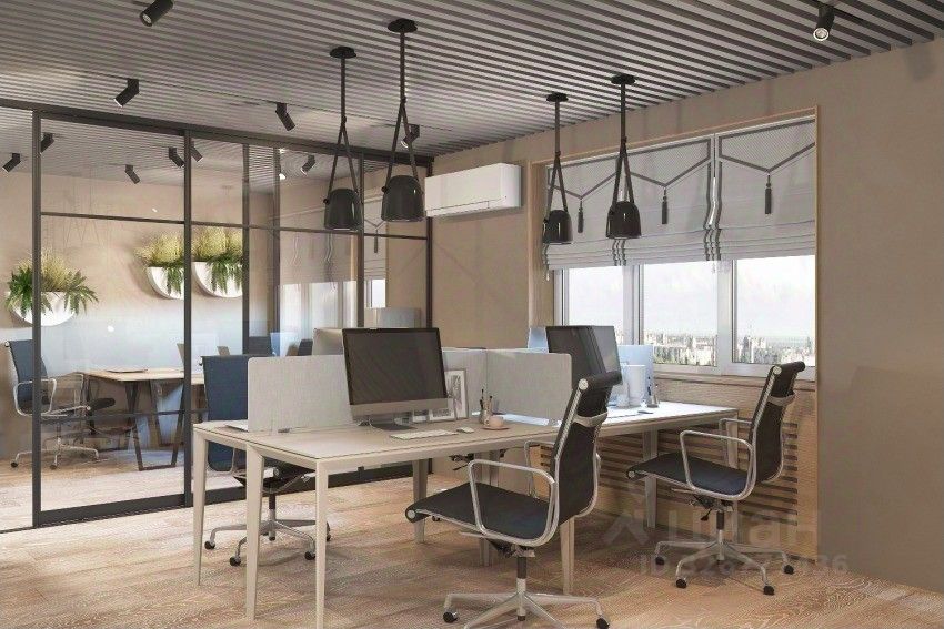 Кабинеты разделены стеклянной перегородкой, что позволяет удобно зонировать пространство — комфортно вести переговоры и принимать посетителей.