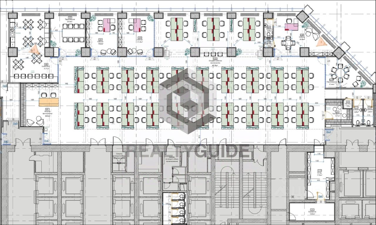 Планировка: 5 кабинетов, оупенспейс, кухня, санузел, с мебелью. На 92 рабочих мест. Эксплуатация входит в стоимость, коммунальные платежи по факту потребления.