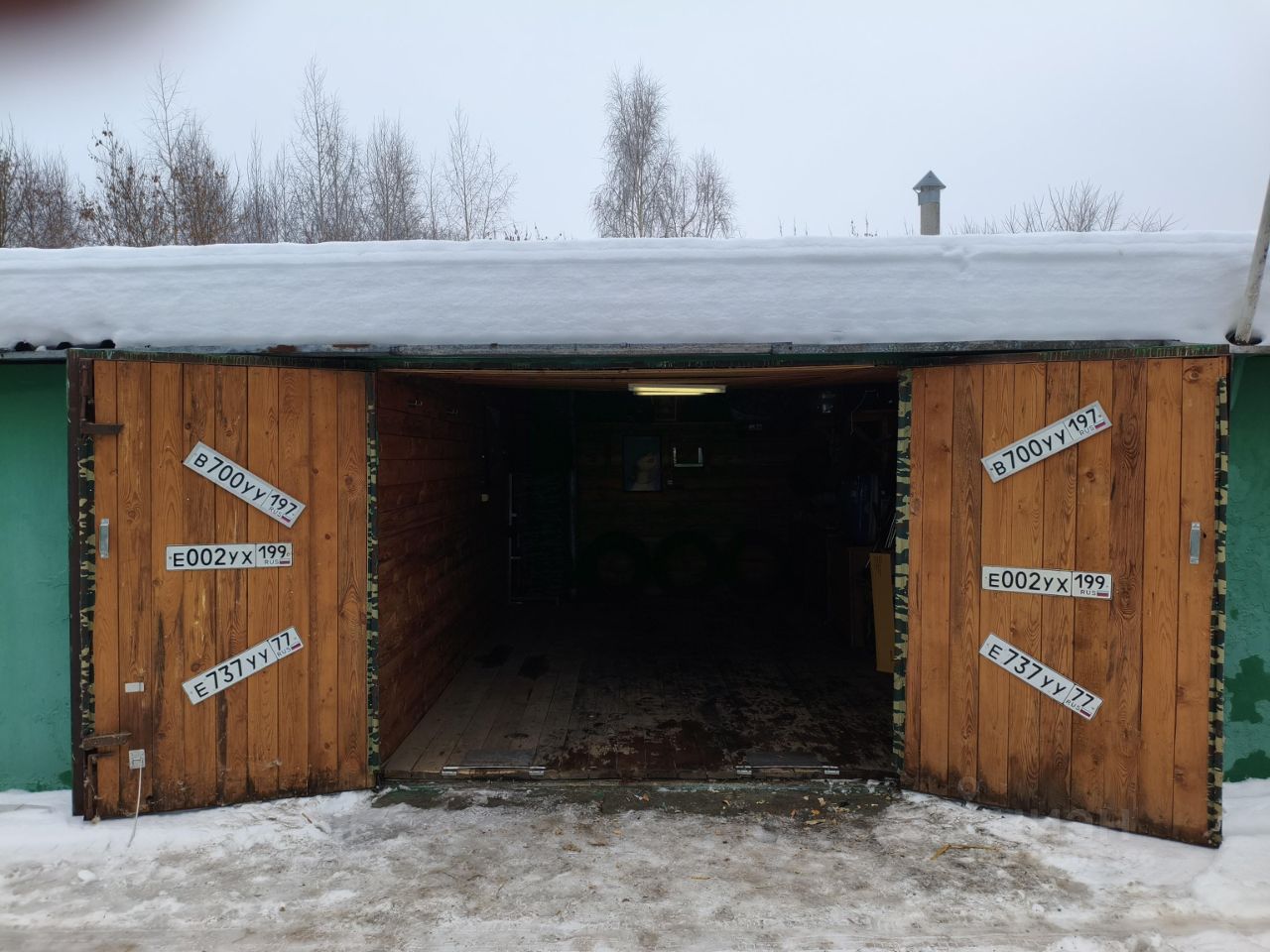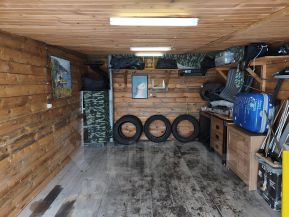 Большой гараж. Обшит вагонкой. Свет, несколько розеток, полки.