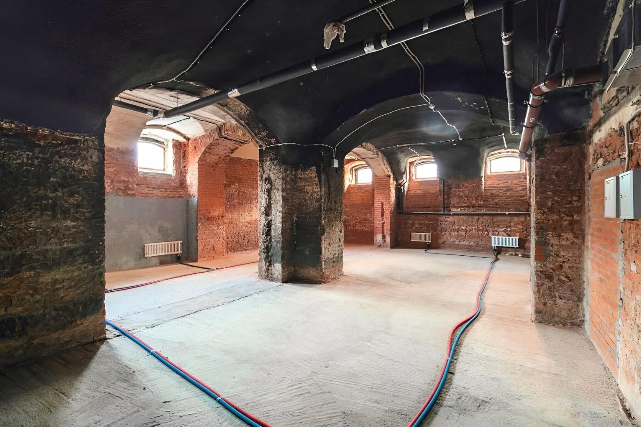 Исторический подвал с окнами по периметру, кирпичной кладкой и сводами в доме, который был построен известным московским архитектором Романом Клейном для Товарищества виноторговли К. Ф. Депре с фирменным магазином и большими винными подвалами на Петровском бульваре.