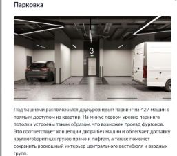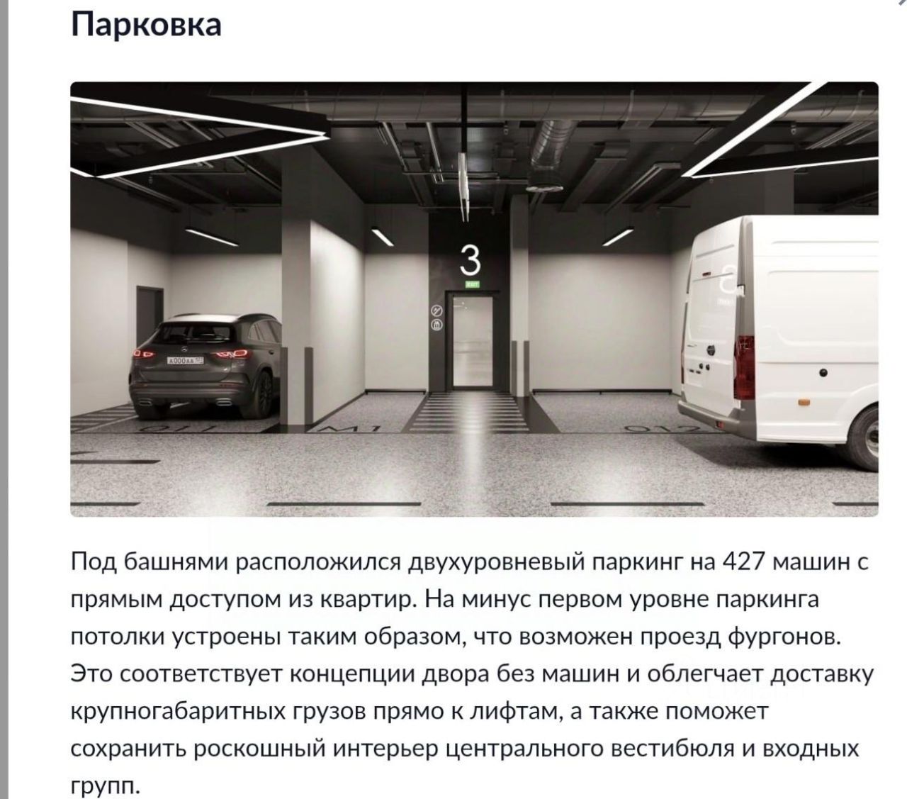 Машиноместо расположено в двухуровневом паркинге с прямым доступом из квартир.