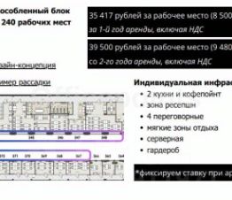 В помещении стандартная отделка, смешанная планировка. 200 рабочих мест. Центральная система кондиционирования и приточно-вытяжная система вентиляции. В наличии наземная парковка (15 000 руб. в месяц за м/место).