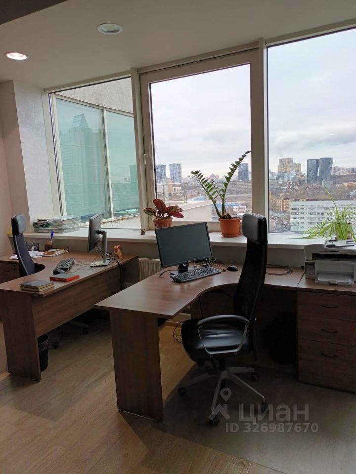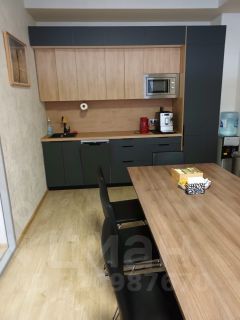 Есть зона кухни с кухонным гарнитуром и мойкой, посудомоечной машиной, холодильником, микроволновой печью. Офис оборудован встроенным шкафом с раздвижными дверями и домофоном. Панорамные окна, открывание на проветривание.
